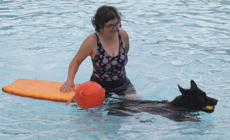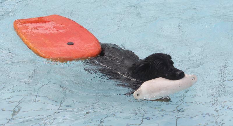 Nachdem alles mit Questis Quietschkrokodil klappte, konnten wir auf größere und schwerere sowie längere Schwimmartikel übergehen. Der Hund muss nämlich dabei lernern, dass er „verfolgt“ wird und etwas einfach nicht abschütteln kann. Endziel ist das Abschleppen seines Besitzers im Notfall. Auch das Hineinspringen wurde immer besser.