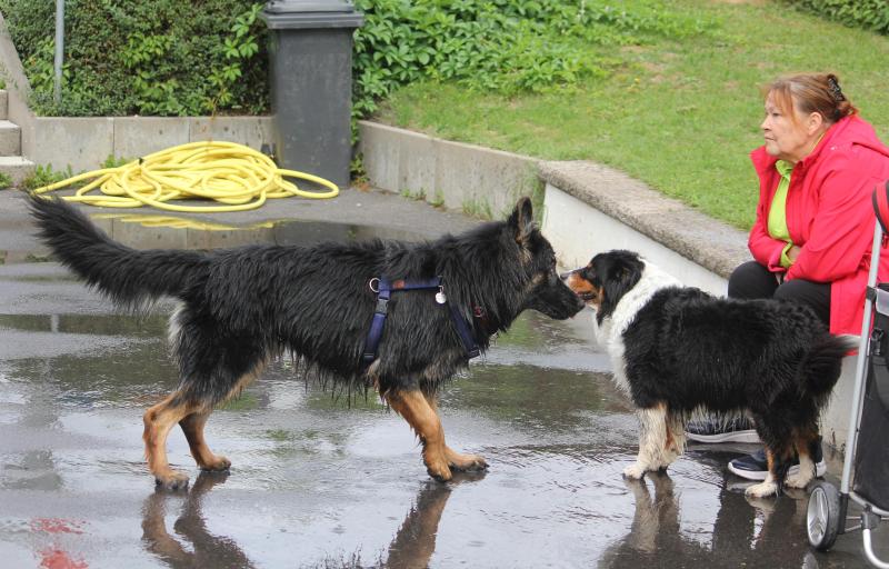 Als Michl und Angelika mit ihren tollen hundegeprägten Enkelkindern sowie Rikki und Q-Ella erschienen, zeigte sich schnell, dass Rikki seine Q-Ella von anderen Rüden stark gefährdet sah, vermutlich auch deshalb, weil sie offensichtlich läufig werden dürfte. Und da muss ein Leitrüde natürlich zeigen, was er von Nebenbuhlern hält – nicht sehr viel, schon gar nicht von Questi, dem Bruder von Q-Ella, der aber gottseidank zu seiner Rasse zurückfand.