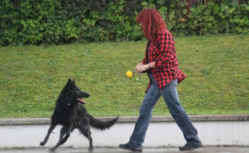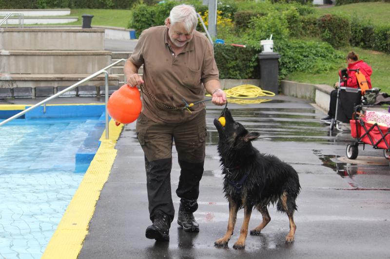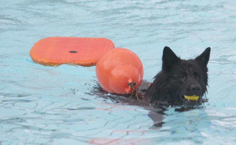 Schnell noch eine kleine Unterordnung mit dem gelben Schwimmball als Beuteanreiz. Und dann ab ins Wasser.