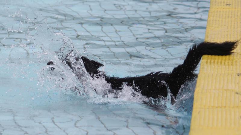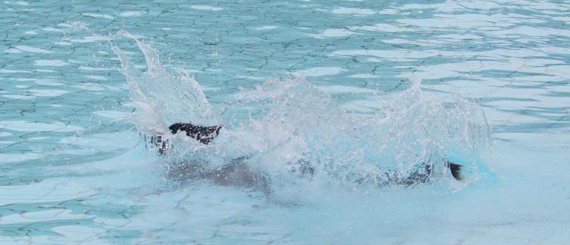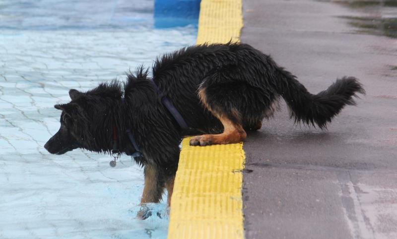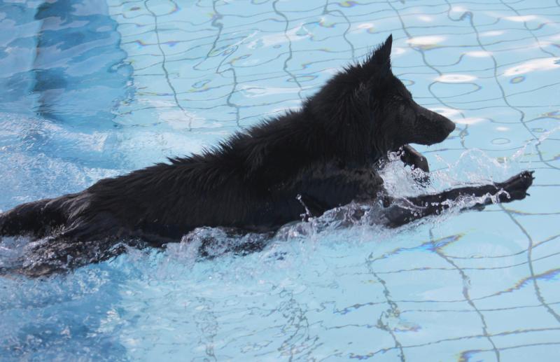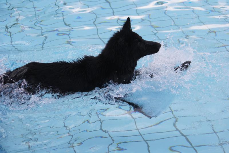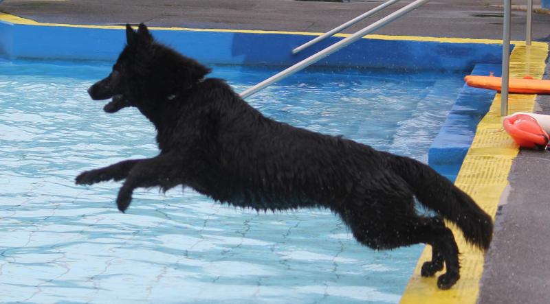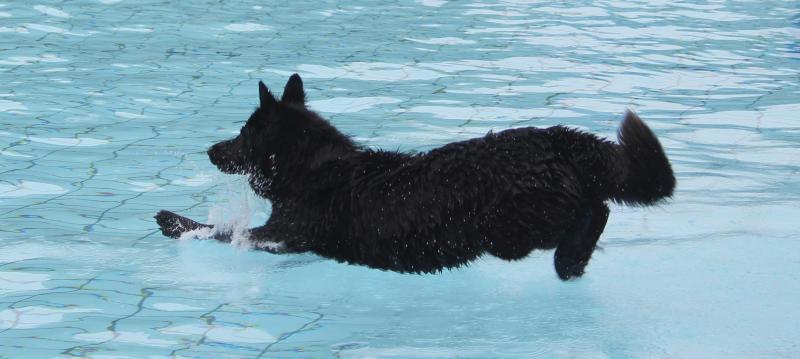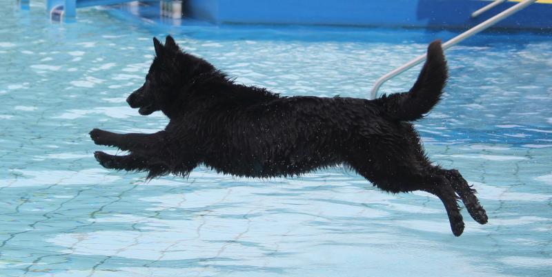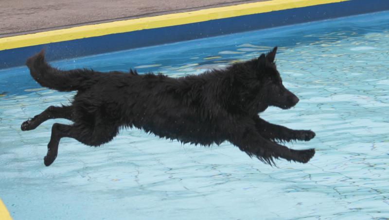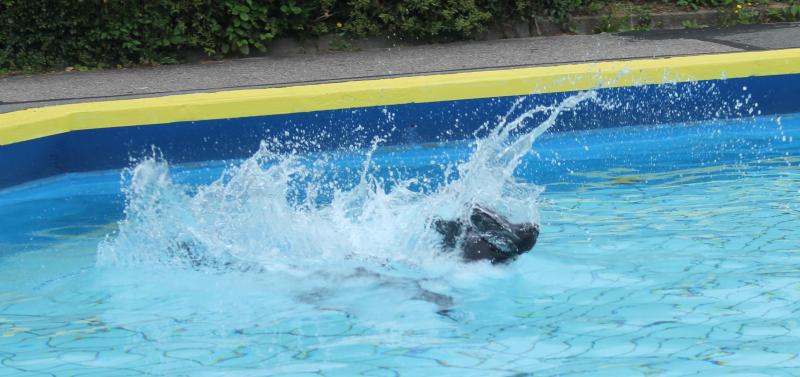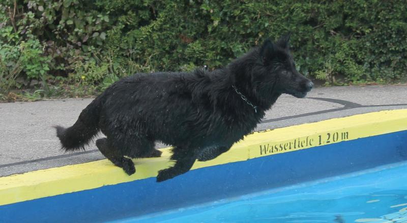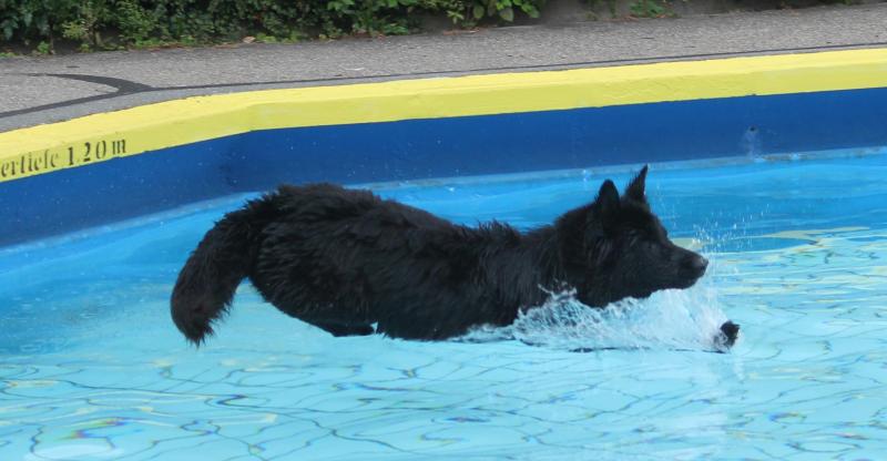 Unsere Jaaki in „Action“. Sie genießt das Hineinspringen vom Beckenrand noch mehr als das Schwimmen selbst im entchlorten Wasser. Leider gibt es im Freibad zu wenige Möglichkeiten für die Hunde zum Verlassen des Schwimmerbeckens, so dass sich das meiste im Nichtschwimmerbecken abspielen muss.