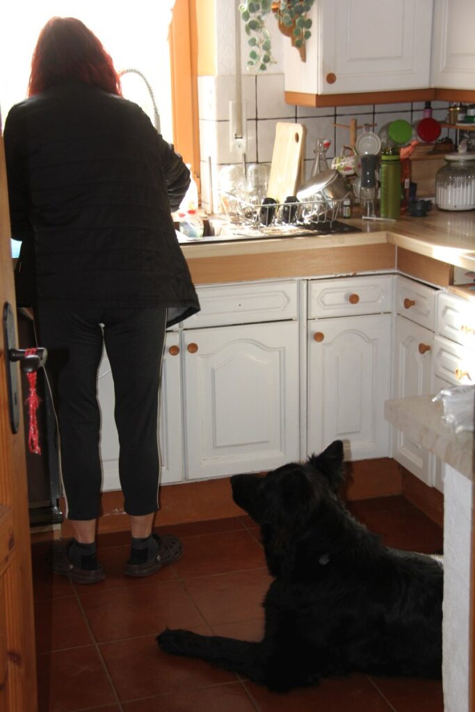 Jaakis Appetit ist nach wie vor groß und sie ist sofort da, wenn es etwas geben könnte. Carmen gibt ihr zusätzlich Himbeerblättertee und Hüttenkäse. Normalerweise sollen Hündinnen das Futter vor dem Beginn des Geburtsgeschehens verweigern, das konnten wir allerdings noch nicht beobachten.