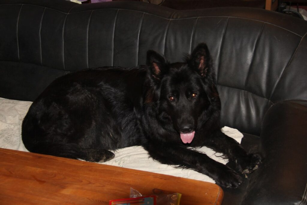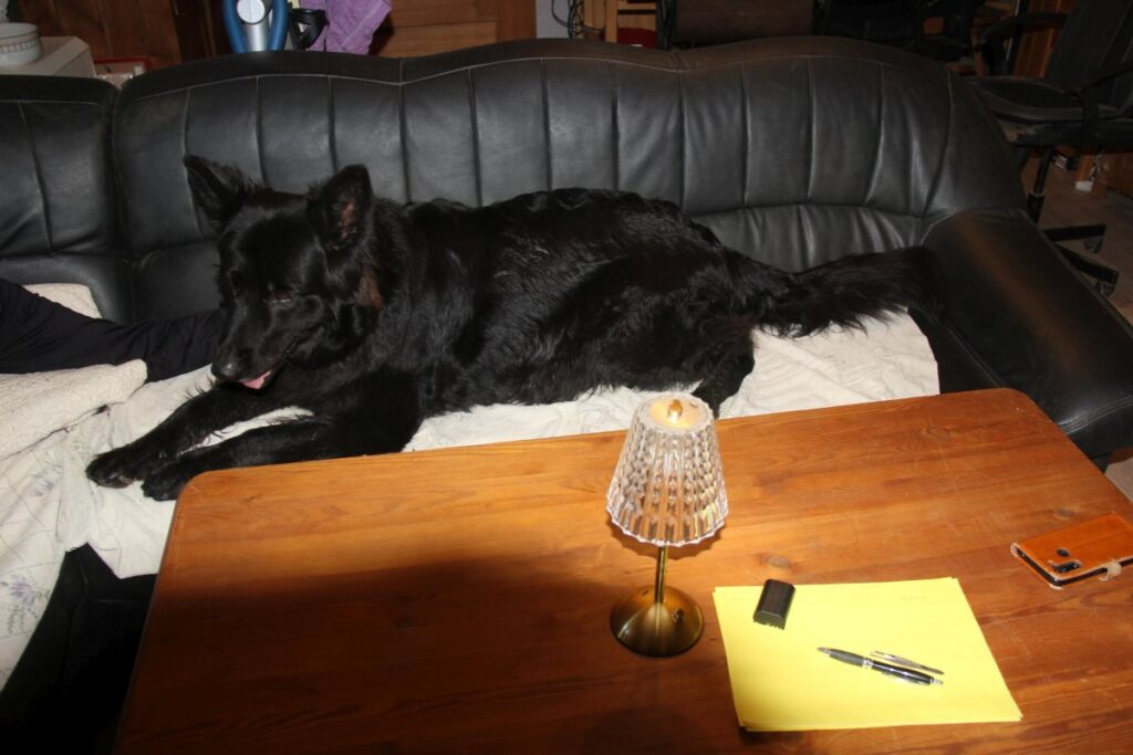 Der Wurfraum ist Jaaki bereits von ihren zurückliegenden Würfen bestens vertraut. Trotzdem haben wir sie immer wieder mal dort abliegen lassen. Bereits die letzten 2 Nächte haben wir mit ihr deshalb im Wurfraum verbracht und mit ihr zusammen auf dem Sofa vor dem Wurfraum geschlafen.