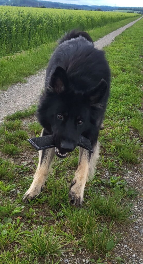 Carmen kennt Django und sein Herrchen Frank Schwaderer vom gemeinsamen Hundeplatz in Talheim und war schon immer begeistert von ihm gewesen, so dass es dadurch erst zu dieser Verpaarung kam. Django verkörpert die uns sehr wichtigen Gebrauchshundeigenschaften, ist dabei klar im Kopf, gesund und wesensfest.